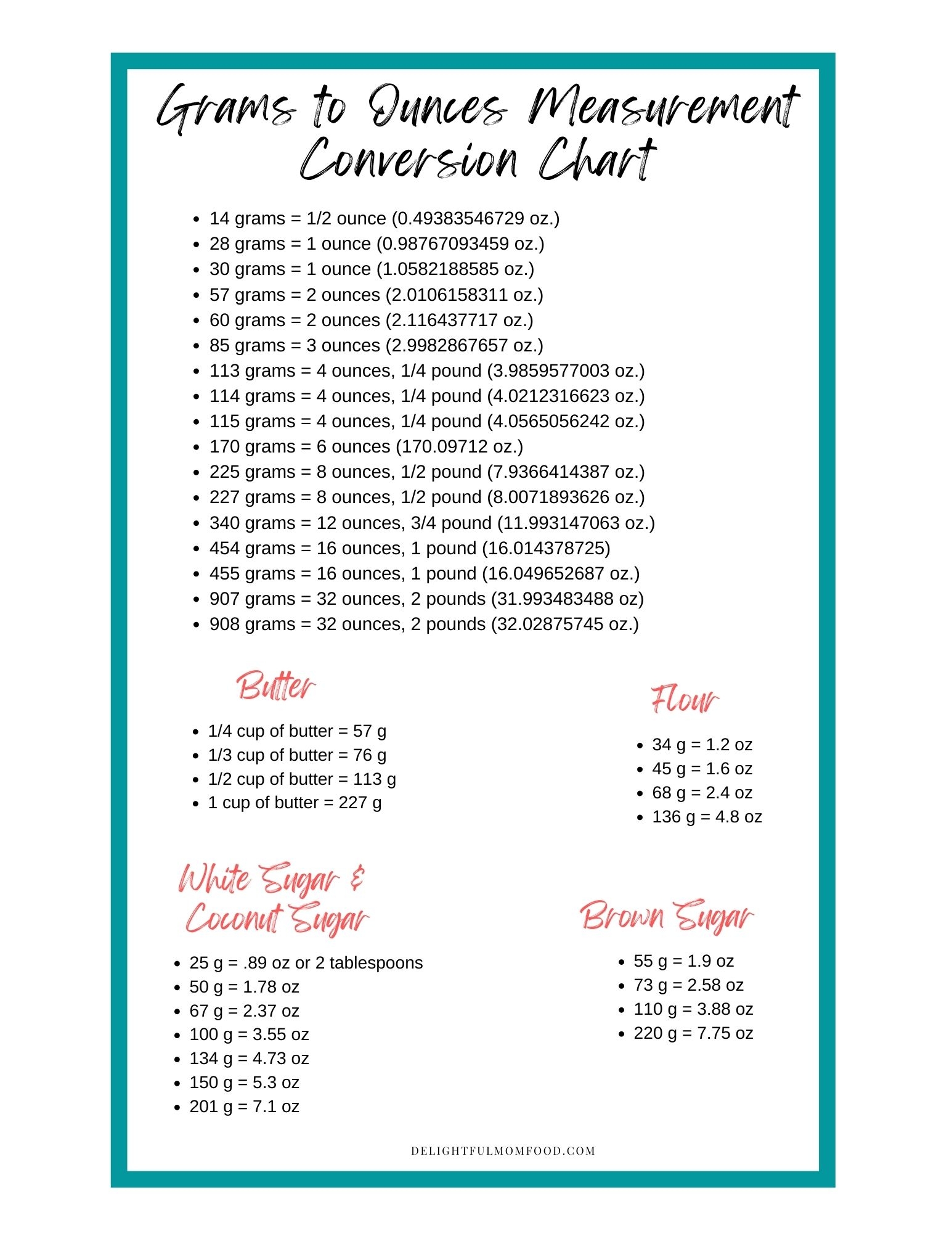 Next time you’re in the kitchen and need to convert grams to ounces, don’t stress. Simply use a printable grams to ounces chart to make the process a breeze. You’ll wonder how you ever cooked without it!